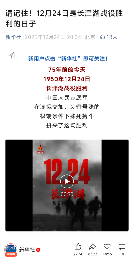 12月24日晚,新华社发文强调:“请记住,12月24日是长津湖战役胜利的日子!” 网友:怀念十年前那个比现在要正常一点的中国
