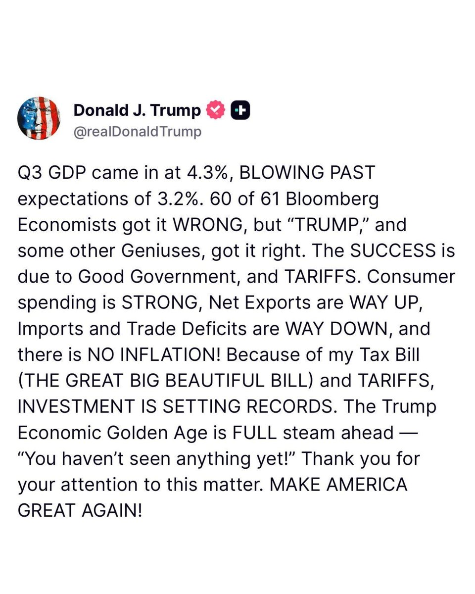 美国第三季度GDP增长4.3%,值得我们高兴吗?推荐看一下MTG的推文 GDP有四个组成部分:消费、投资、政府支出和外贸盈余。消费中最显著的是健康和医疗服务,增长了80%!保险和服务等也增长显著。外贸方面,关税导致进口减少了,赤字也减少了。 GDP增长了,美国人体感反而不好了。