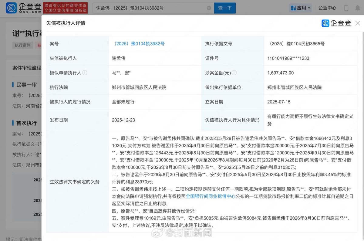12月23日,企查查APP显示,演员谢孟伟(“嘎子哥”)近日因“有履行能力而拒不履行生效法律文书确定的义务”,被法院列为失信被执行人,涉及一宗金额约169万元的民间借贷纠纷。相关文书显示,原被告双方确认,谢孟伟共欠借款本金166万元及利息3万余元,并约定分期偿还;如未按约定按期足额支付任一期款项,