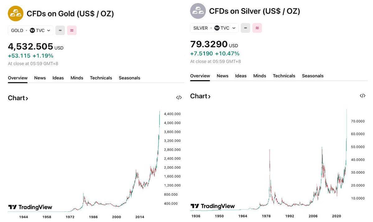 2025 年末的魔幻故事 ▶︎ 朝阳行业:炒作金银(贵金属) ▶︎ 夕阳行业:炒作数字金银(加密货币) 那么问题来了:是币圈做空妖币被套更惨,还是做空贵金属并遇上几十年难一遇的大暴涨被套更惨呢🥹