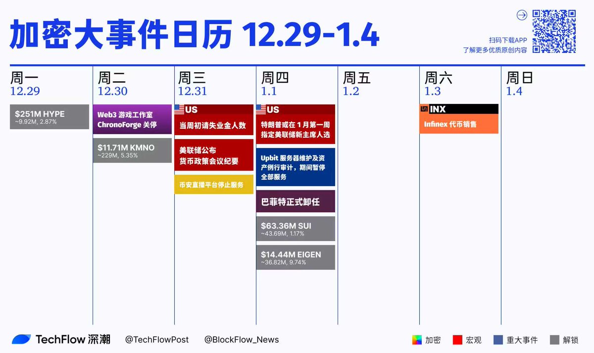 🌐 2025年12月29日-2026年1月4日|本周大事件 📅 2025年12月29日|星期一 🔵 $HYPE 将于 12 月 29 日下午 3 点 30 分解锁 992 万枚代币,价值约 2.51 亿美元,占流通量 2.87% 📅 2025年12月30日|星期二 🔵 Web3 游戏工作室 ChronoForge 因资金短缺关停 🔵 $KMNO 将于 12 月 30 日晚上 8 点解锁