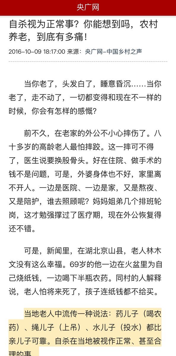 根据清华大学的调查报告显示,近几年,70至74岁的农村老人自杀率一直在提高,是世界平均水平的四倍到五倍,跃居世界第一位。