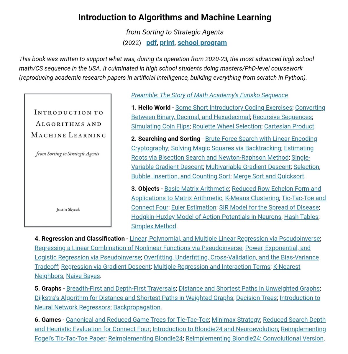 免费电子书📚《算法与机器学习导论》 这本书是作者Justin Skycak专门为美国硬核高中数学/CS课程Eurisko编写的教材。 这课程有多硬核? 高中生直接复现AI学术论文,用Python从零手撸所有算法。最近作者的一位学生Matteo刚被NASA局长亲自邀请申请职位,还附赠战斗机试飞体验作为"签约奖励"。
