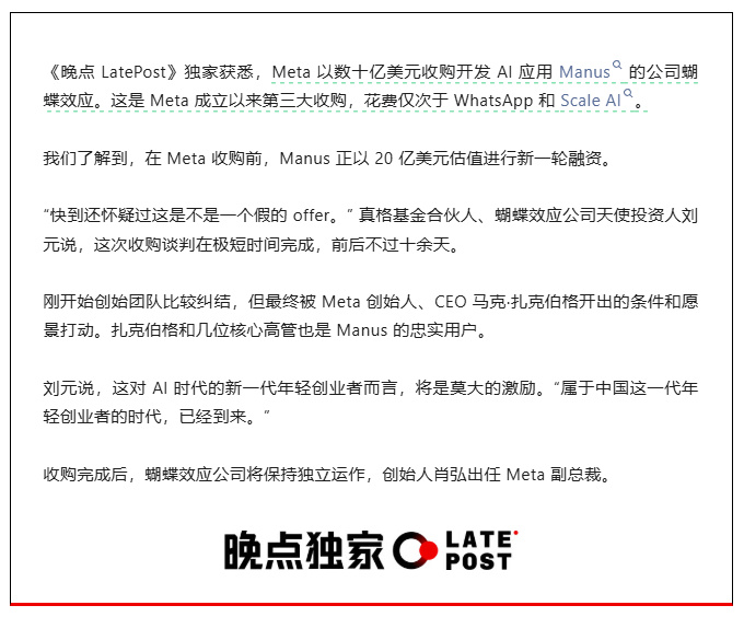【Meta 数十亿美元收购 Manus,肖弘将出任 Meta 副总裁】 《晚点 LatePost》独家获悉,Meta 以数十亿美元收购开发 AI 应用 Manus 的公司蝴蝶效应。这是 Meta 成立以来第三大收购,花费仅次于 WhatsApp 和 Scale AI。 我们了解到,在 Meta 收购前,Manus 正以 20 亿美元估值进行新一轮融资。