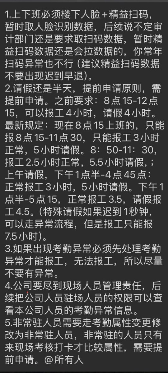 网友投稿 杭州农商银行 内部通知显示:上下班需“楼下人脸识别+精益扫码”,请假、报工时被细化到分钟、迟到、早退、扫码异常均可能影响报工时。