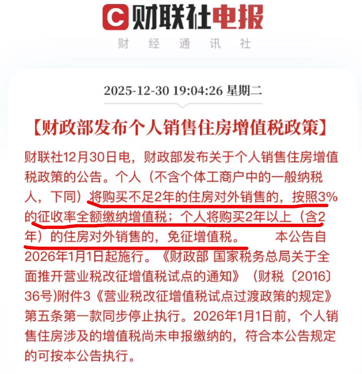 个人(不含个体工商户中的一般纳税人,下同)将购买不足2年的住房对外销售的,按照3%的征收率全额缴纳增值税; 个人将购买2年以上(含2年)的住房对外销售的,免征增值税。 楼市重大利好🫣