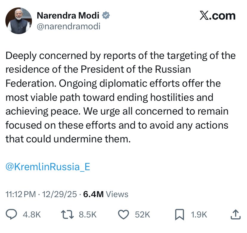 普京说他的居所遭到无人机袭击。特朗普信了,而且非常愤怒;莫迪也信了,说这会破坏外交努力 假冒为善的人无视普京每天都在屠杀平民,轰炸政府大楼,数次暗杀泽连斯基。2024年3月泽连斯基在敖德萨接待希腊总理的访问,一枚导弹在他们附近爆炸。 ——俄罗斯大V们欢呼雀跃,说普京又取得了巨大的胜利。