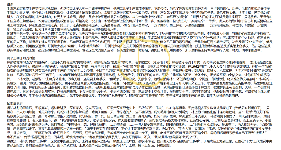 史伏初:毛王朝演义 毛泽东生前说过,他的一生只做成两件事,其一,把蒋介石赶到小岛上去了,夺得中国大陆政权,其二,搞了文化大革命。其实,他还有两件失败的业绩,不好意思说出口:其一,想当“世界人民的红太阳”没当成,其二,想在中国建立一个世袭制的毛王朝,也惨败了。今天不说前者,单道后者。