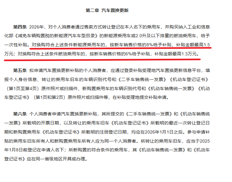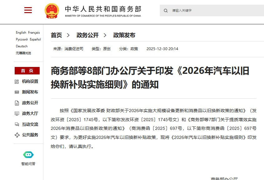 12月30日,商务部等8部门办公厅印发《2026年汽车以旧换新补贴实施细则》,明确2026年汽车以旧换新补贴政策的具体实施安排,根据细则,对符合条件的个人消费者报废旧车并购买新车,或通过转让旧车置换新车的,可按规定申请一次性财政补贴。其中,报废旧车购买新能源乘用车或符合条件的燃油乘用车,分别