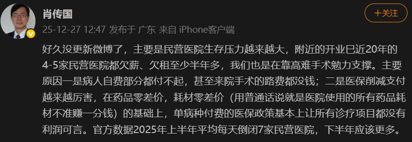 肖传国:民营医院的生存压力越来越大。