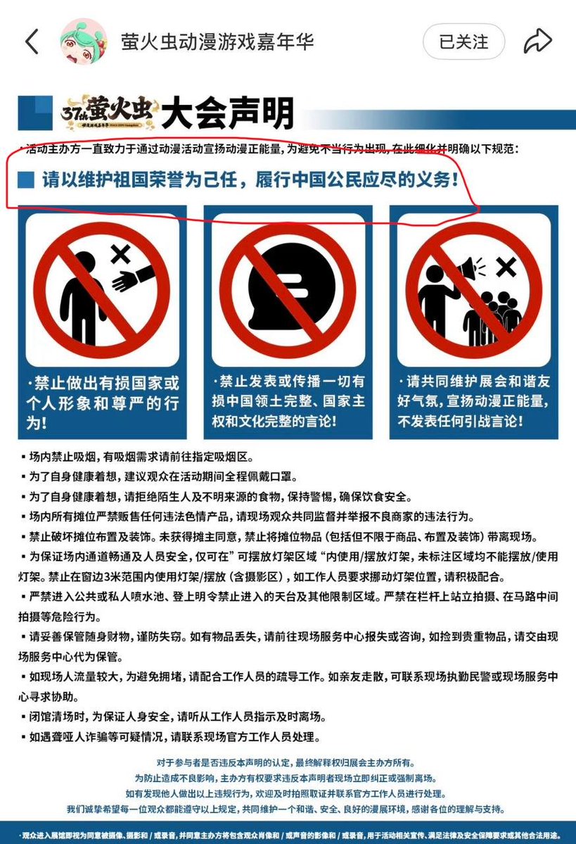 1月1日,广州萤火虫漫展突然发布声明,要求严禁出现 Cosplay 辱华、反华倾向,有损中华民族团结感情的角色,不得侮辱先烈。 严禁穿着、佩戴或使用任何形式的日本传统。 同时要求:“维护祖国荣誉为己任,履行中国公民应尽的义务。” 评论区部分人在讨论哪些cos服可以穿进去。