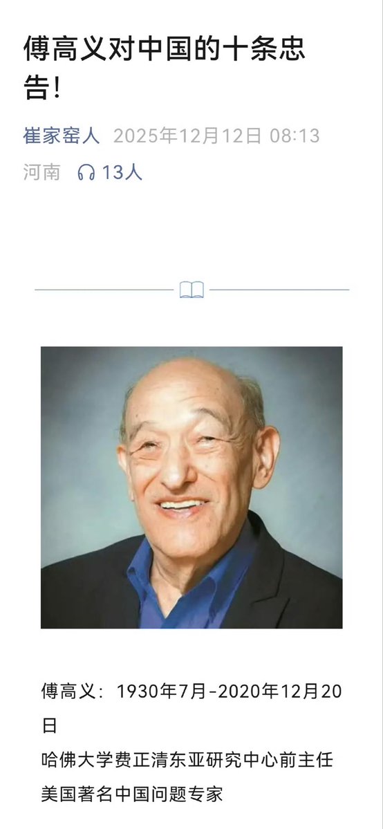 傅高义生前是美国中国研究领袖,对中国非常亲善,他给中国留下十条忠告,大体包括: 一、中国应向世界接轨,而不是相反。 二、中国应正确面对近现代历史,走出“仇外情节”。 三、中国应与日本和好,走向暖政而不是撕裂。 可惜是对牛弹琴,一个假博士怎能理解真教授?