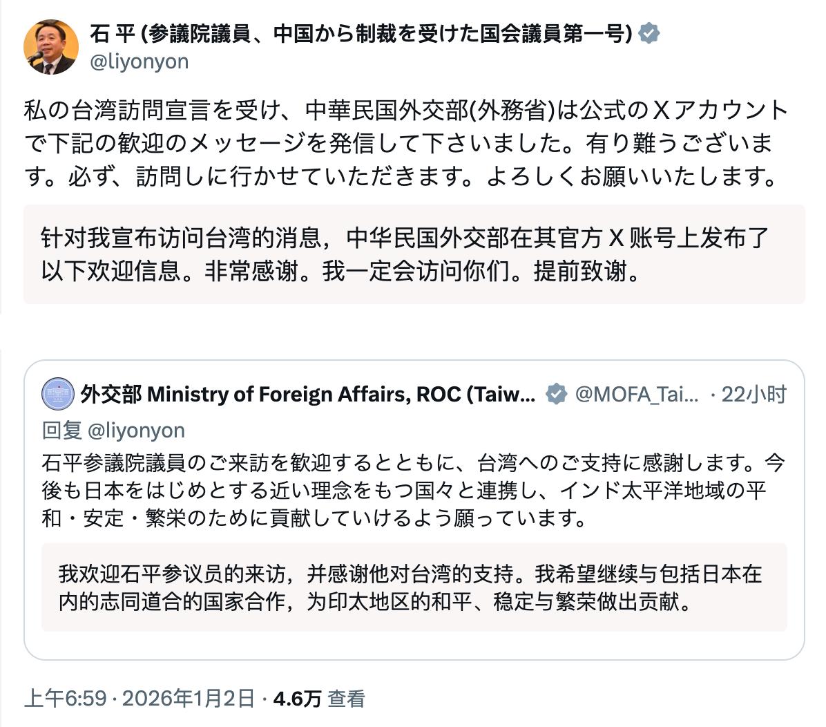 1月2日,台湾外交部在 X 平台发文表示,欢迎石平议员访问台湾。
