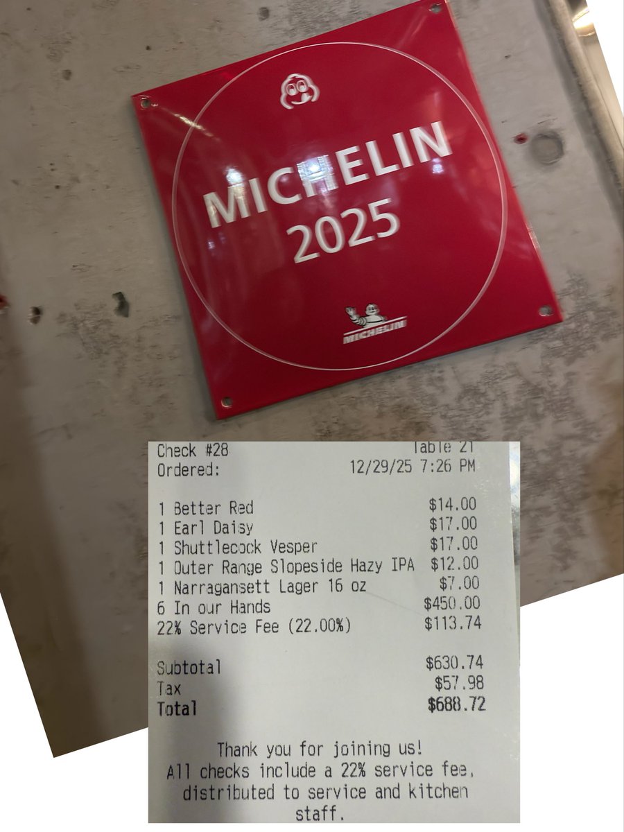 #美国斩杀线 意大利饭店,米其林指南,还没有星,从Farm to Table, 6人消费688美元,其中小费113美元。面包是我吃过最好吃的面包,鱼相当好吃,意大利烩饭还不如我烧的青菜泡饭好吃,他家的小青菜用白葡萄酒加辣椒,白葡萄酒高温加热后变酸,我认为失败,甜点一般。