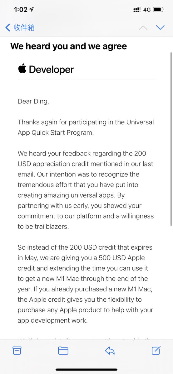 给 Apple 写信没有白写,贡献了自己的一点点想法。刚刚收到 Apple 的邮件了,说他们听到了声音,决定将代金券从 200 美元变成 500 美元,并且可以延长到 2021 一整年!