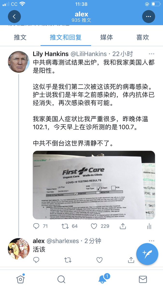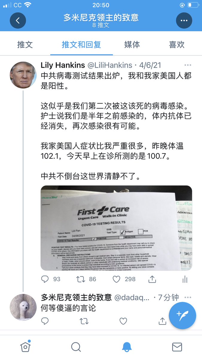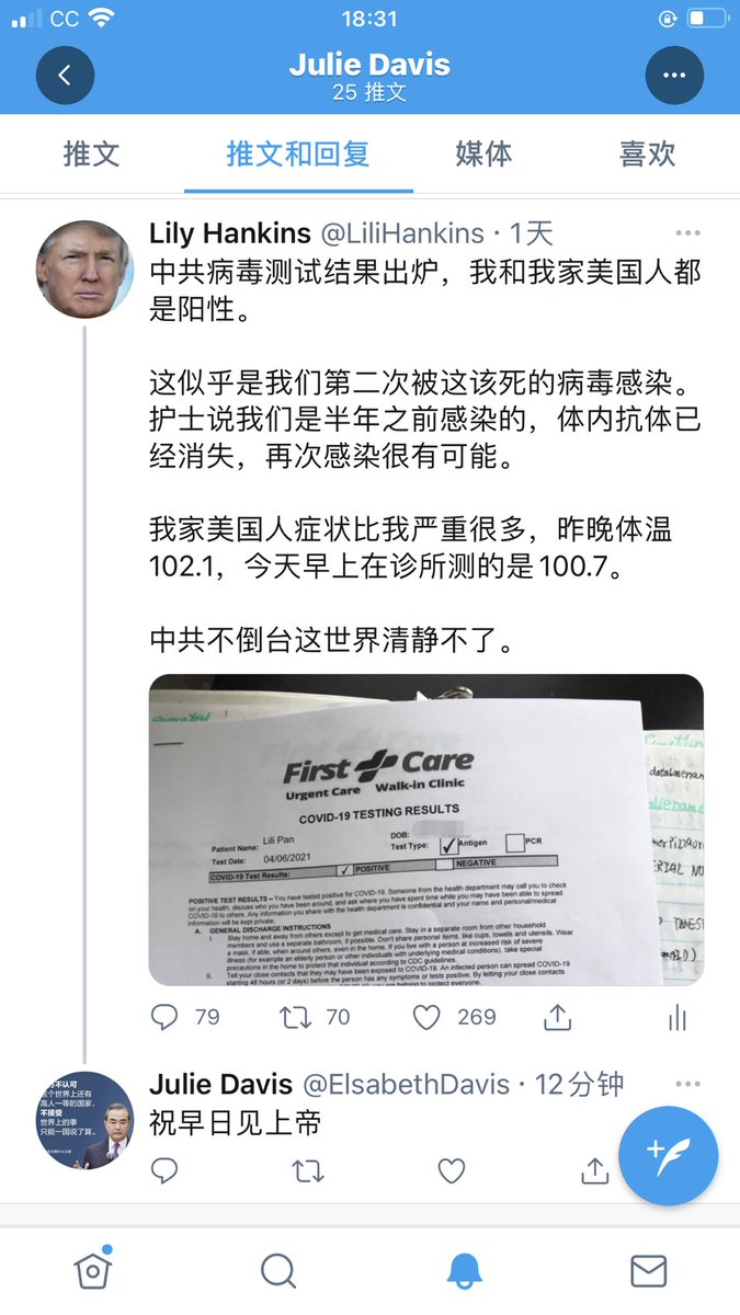 感谢上帝保佑,我丈夫已经完全从中共病毒的不适中恢复过来了。令我不理解的是我并没有在原推文中指责任何人,只是说了一句我对邪恶政权的看法,怎么就跟踩了谁的尾巴似的,时不时跳出来展示他们的恶毒与无人性。发了霉的脏东西,需要晒太阳: