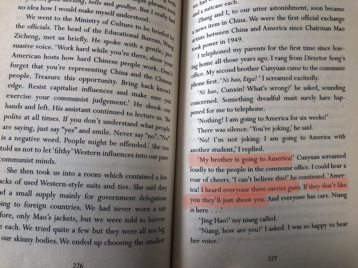 在读一本人物传记。时间回到1979年,作为新中国第一个去美国的艺术交换生,作者激动的给老家哥哥打电话。哥哥说“我听说美国每个人都拿枪,看谁不爽就开枪”……40多年后的今天看到这个描述,好像没啥大问题。