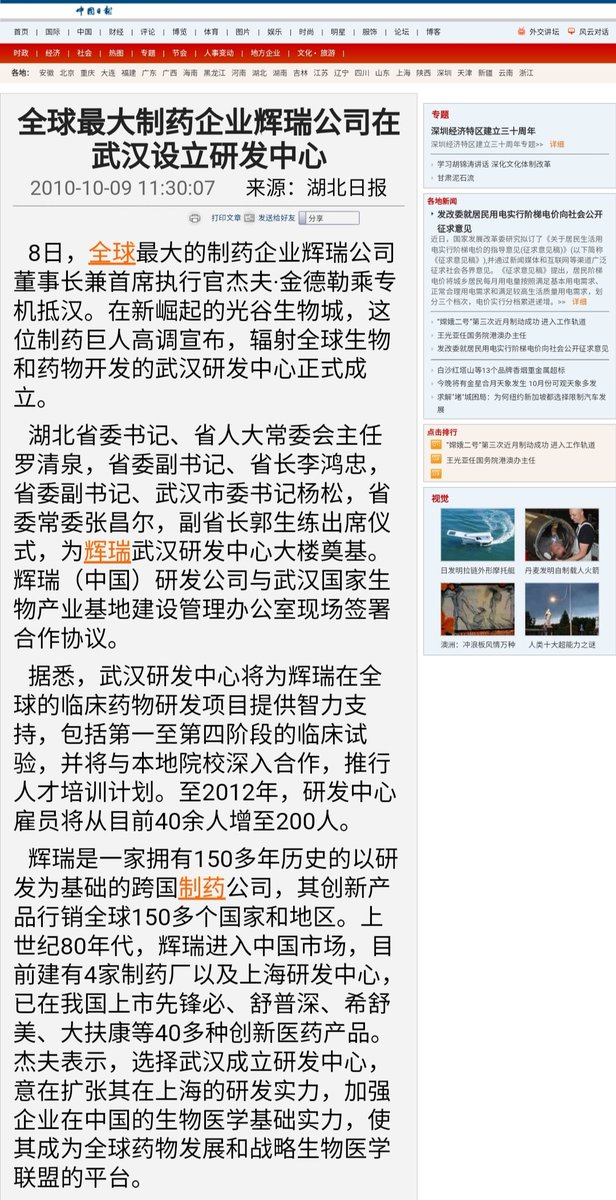 2010年,辉瑞落户武汉,就在武汉生物研究所旁边。