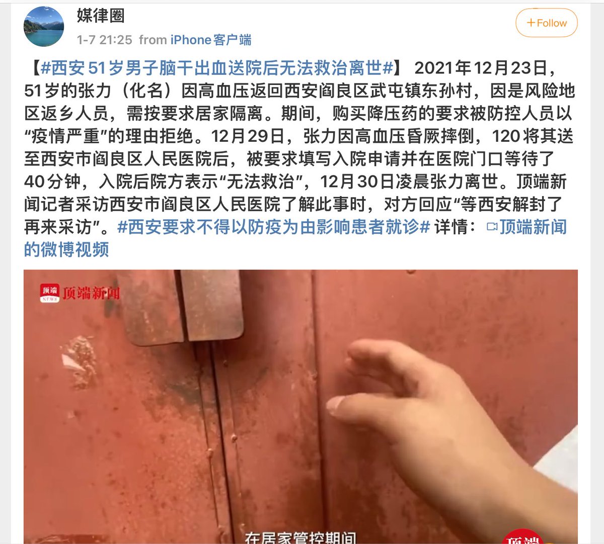 如果他当时不是因为无人性的防疫不让买降压药,及时服药很可能不至于脑出血,入院时医院再耽误一阵,人就没了。视频里显示的是他家的门当时被封了,痕迹尚在。