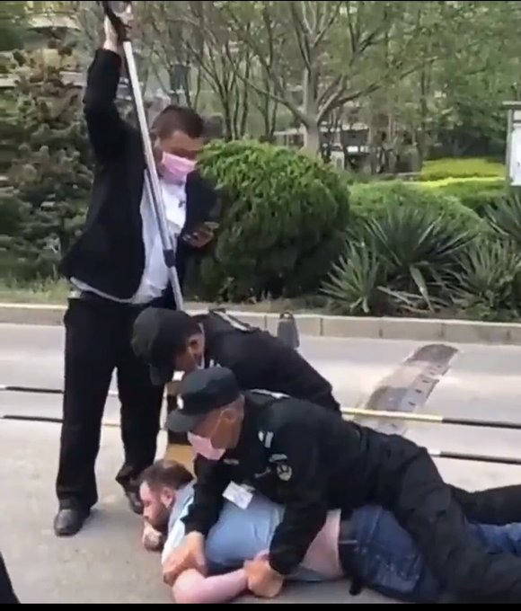 北京朝阳,警察扑倒一名不戴口罩的外国人。