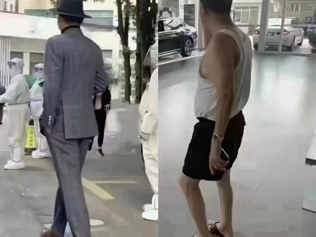 上海与广州中老年男人下楼测核酸时的穿搭比较。上海:休闲爵士帽198元,布洛克皮鞋1698元,阿玛尼西服三件套2.2万。广东:白背心18元,黑短裤26元,老年防滑拖鞋15元,劳力士手表25万。