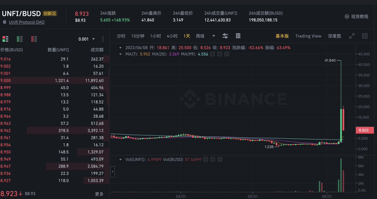 今天看到了币安上一个山寨币 $UNFI 忽然跳涨10倍,然后又快速回落,让大量做空客被清盘,出于好奇,研究了一下这个代币的背景和原因,也明白了币安另一种更高级的合约连带收割方式,难道在 $LUNA 中亏的钱用这种方式赚回来?