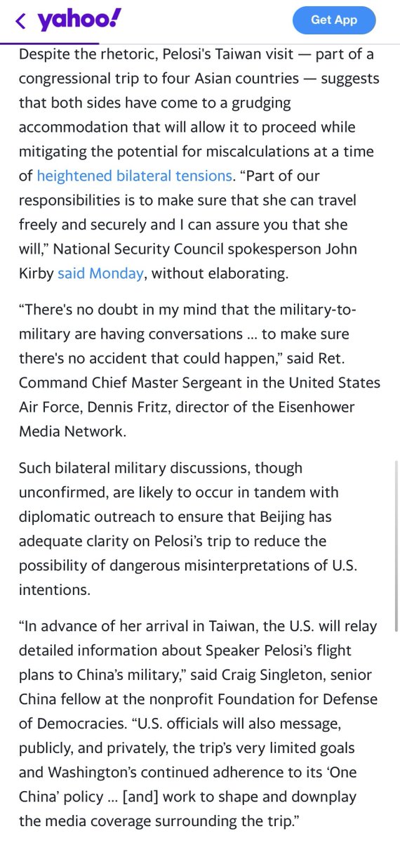 关于佩洛西议长的台湾之行,美国军方与中国军方保持着联系。美国军方会事先把佩洛西的飞行计划通知中国军方,避免擦枪走火发生意外。中国战狼的嘴炮都是打给墙内愚民看的。只有像胡锡进这种恐怖分子、战争狂人才会意淫要把邦交国的议长专机打下来。