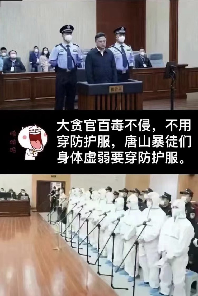 这确实是个问题:为什么同时审理的案件,部级高官受审时穿着夹克,而唐山的犯罪嫌疑人却被遮挡的一点也看不清谁是谁?这中间的程序正义和科学依据是什么?