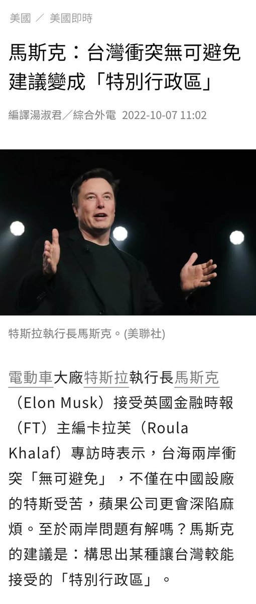 马斯克在接受专访时建议台湾成为中国的特别行政区来避免台海冲突,他相信,中共可能会给予台湾比香港更多的自由。请问台湾现在还不够自由民主吗?要靠大陆恩赐?