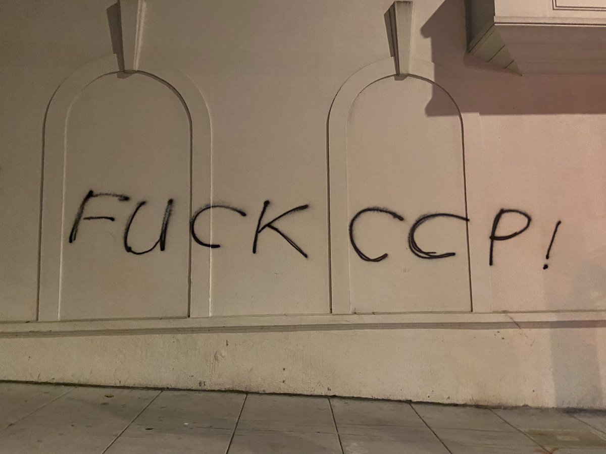 错过精彩了,有位勇士喷漆了,但是没看到谁喷的地址在旧金山中国总领馆