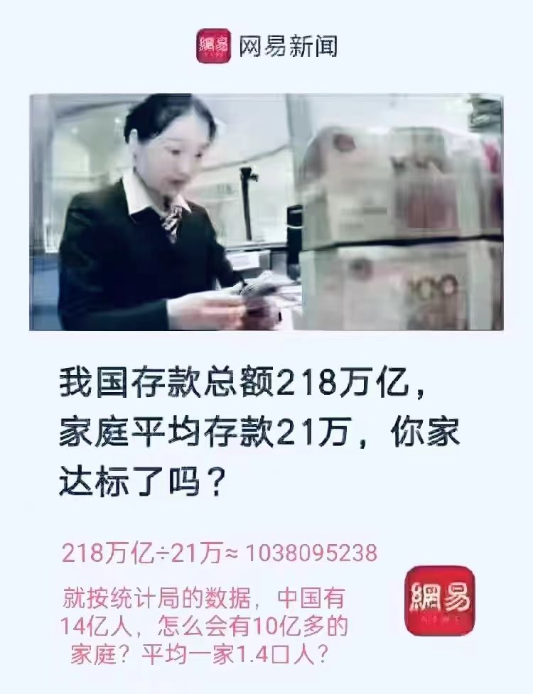 这个账对不上,国家统计局是咋算的?腾讯 网易【家庭平均存款:你家达标了吗?】