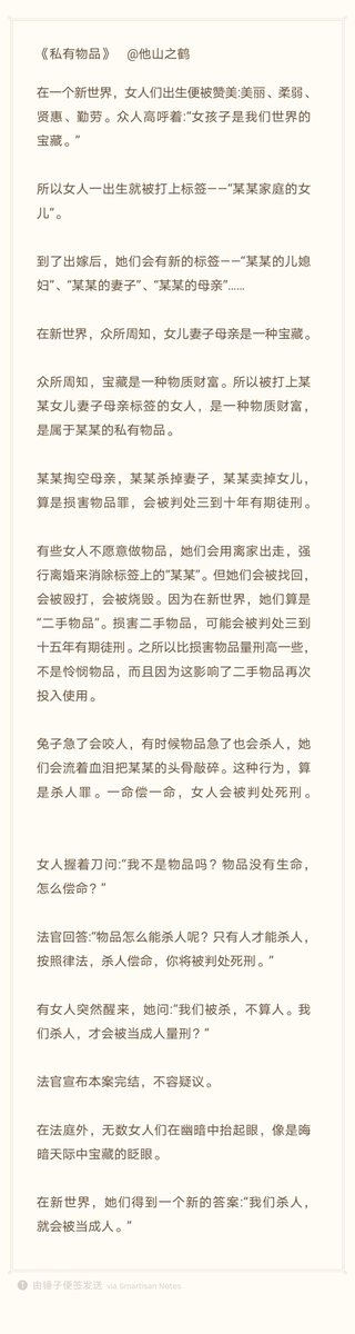 《私有物品》 by他山之鹤“在法庭外,无数女人们在幽暗中抬起眼,像是晦暗天际中宝藏的眨眼。”“在新世界,她们得到一个新答案:‘我们杀人,就会被当成人。’”