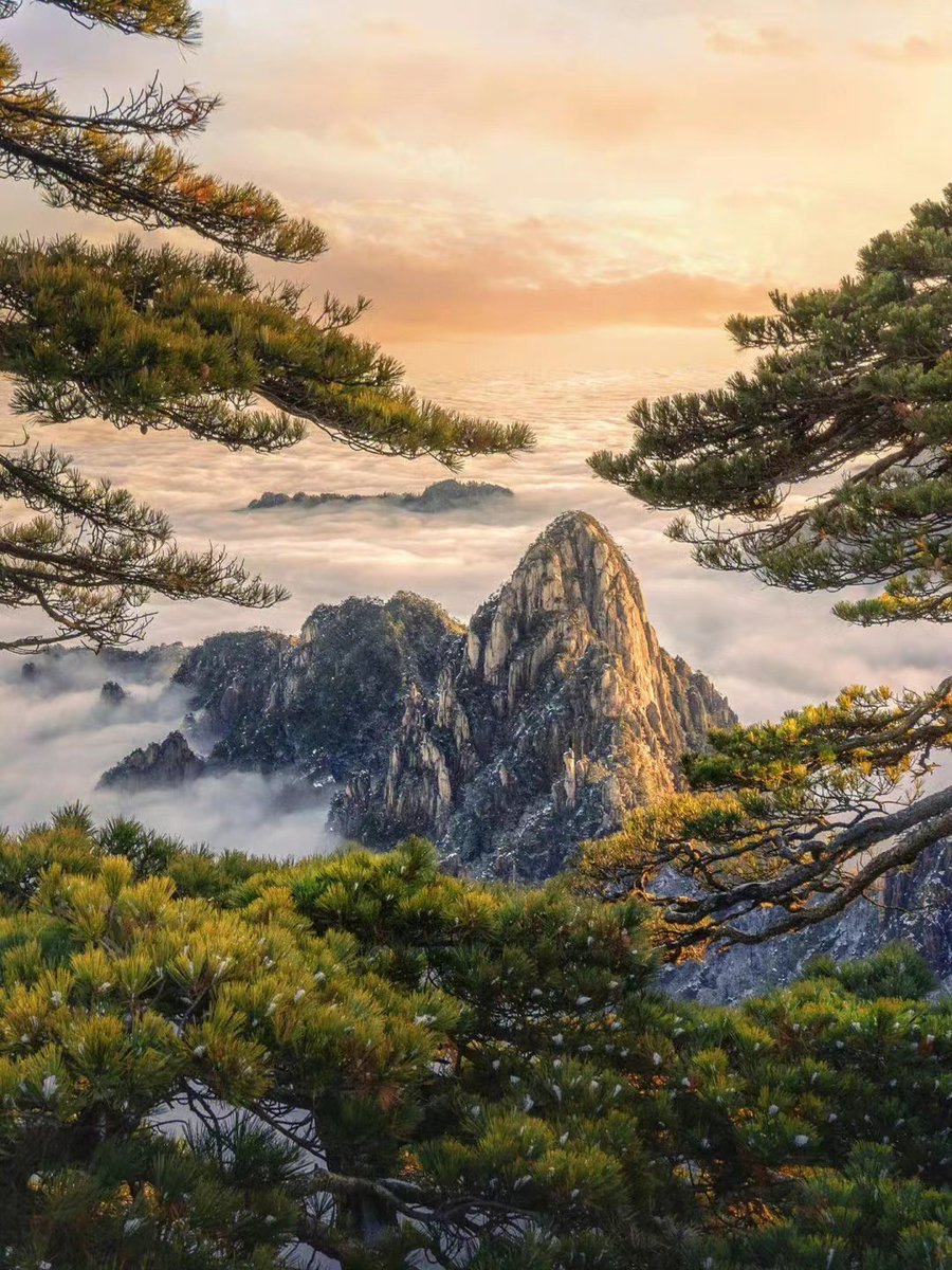 Sea of clouds in Huang Shan Mountain.人间多少佳山水,独许黄山胜太华。云海波澜峰作岛,天风来去雨飞花。