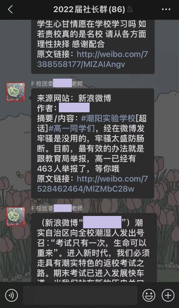 广东省汕头市潮阳实验中学有团委老师在学生社团群里曝光在微博上发表抗议开学言论的学生,疑似想要人肉学生。