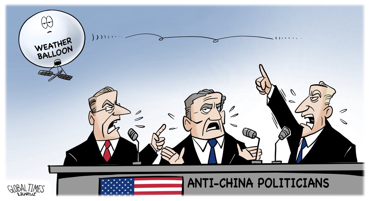 American anti-China politicians make a fuss about Chinese weather #balloon.美反华政客借题发挥炒作“流浪气球”事件。