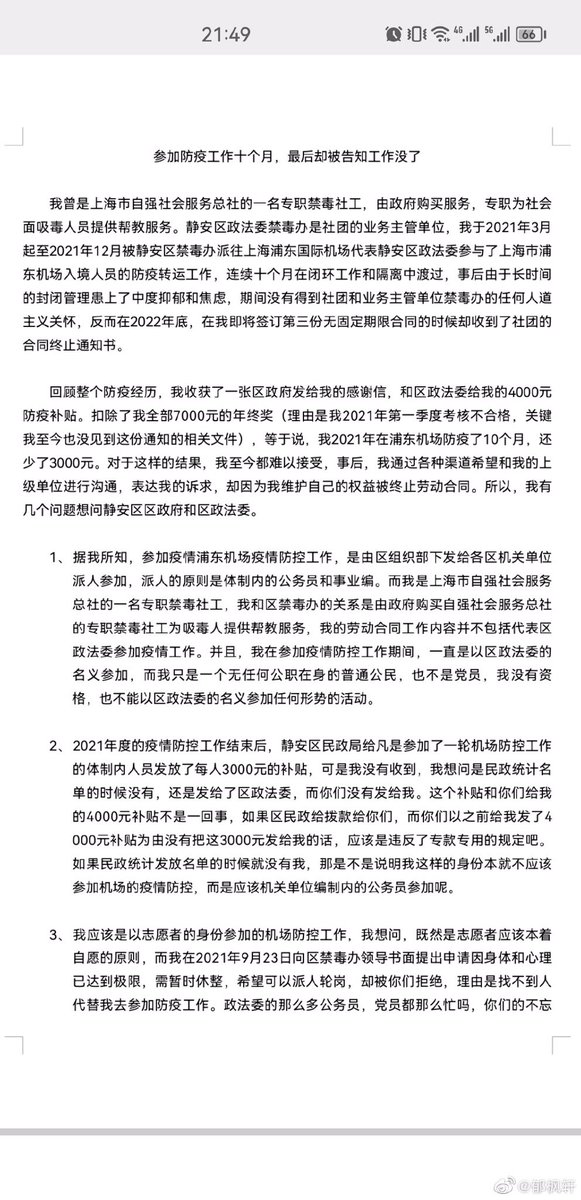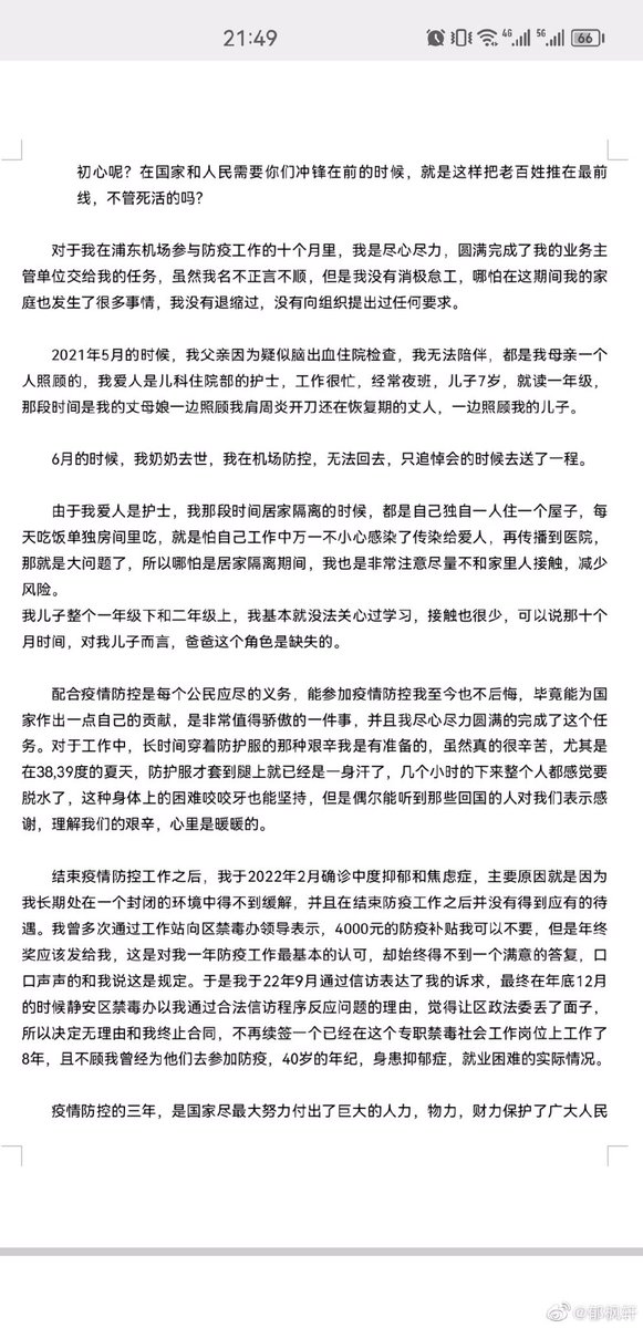 被派到浦东机场做入境转运的大白,封闭管理十个月,患上抑郁症,40岁,就业困难的情况下被告知工作没了,讨要说法一直不被理睬,希望微博上引起有关部门重视