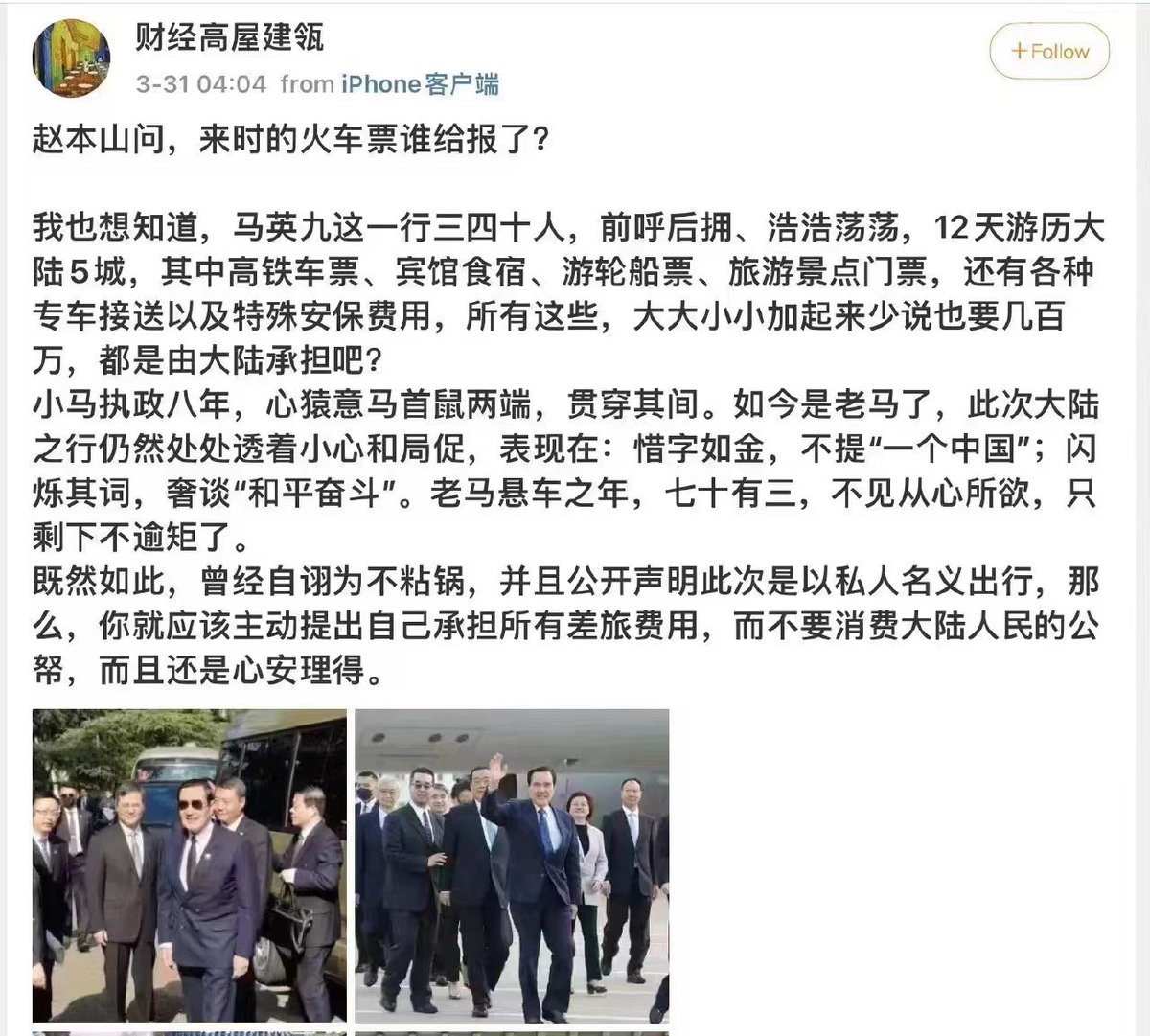 统一大业,要算政治账!……想知道,马英九一行三四十人,12天游历大陆5城,其中高铁车票、宾馆食宿、游轮船票、旅游景点门票,还有各种专车接送以及特殊安保费用……【都是由大陆纳税人承担吧?】