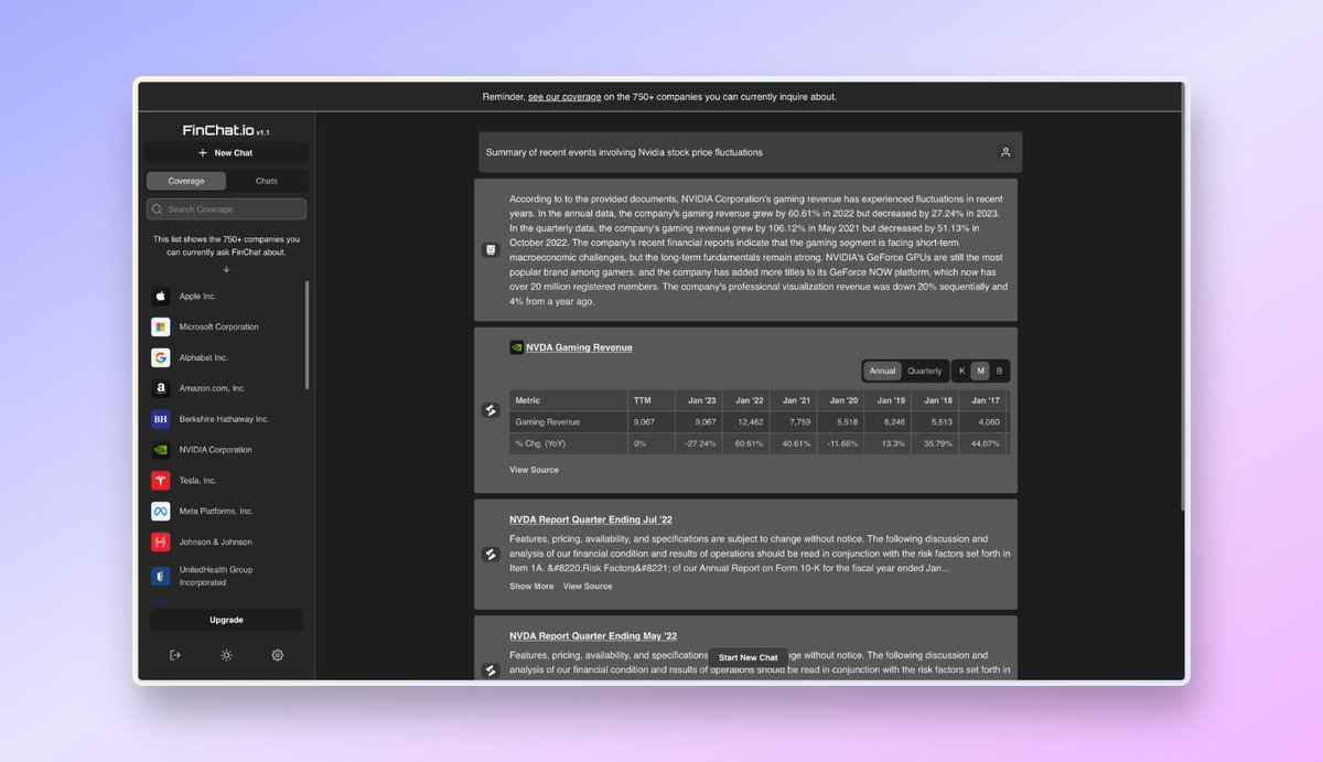 Finchat:一个金融信息的ChatGPT,里面有750多家公司的金融数据和100多家大投资人的信息。输入你的问题后他能给你检索到相关信息并给出提要。链接: