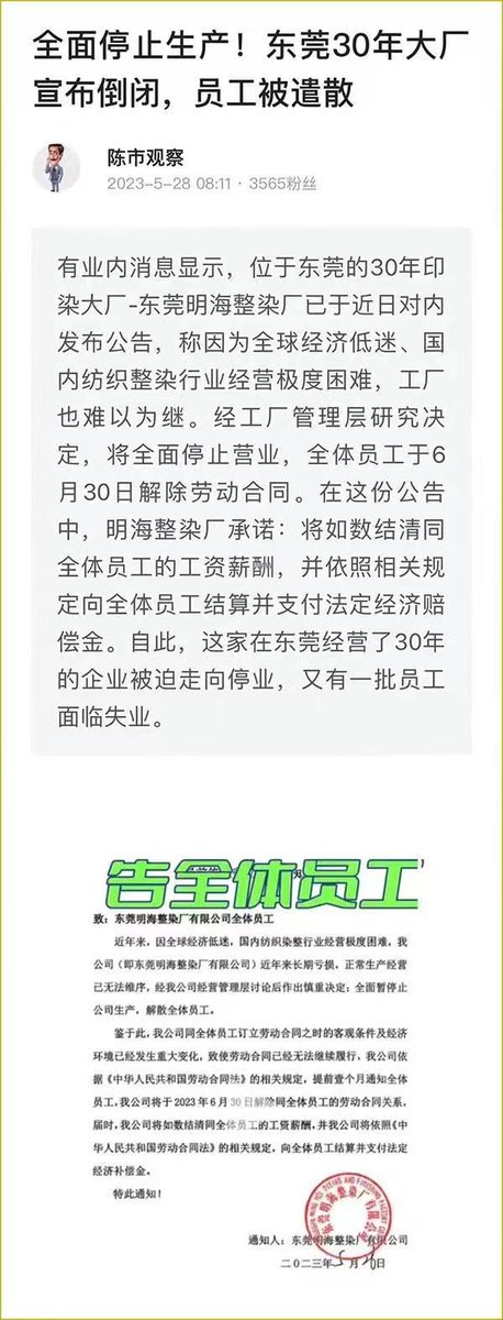 服装厂倒了一片,印染厂岂能独活?【全面停止生产!东莞30年大厂宣布倒闭,员工被遣散】