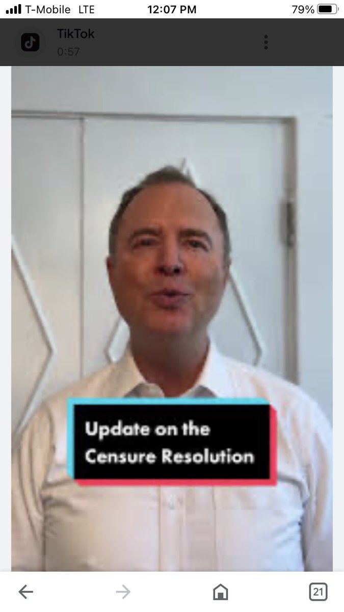民主党重量级人物,加州联邦众议员Adam Schiff 被国会通过正式譴責。原因是他在担任前国会情报委员会主席时利用职务特权的优势在一项迫害川普通俄门案件上刻意误导美国人民,向美国人民撒谎。