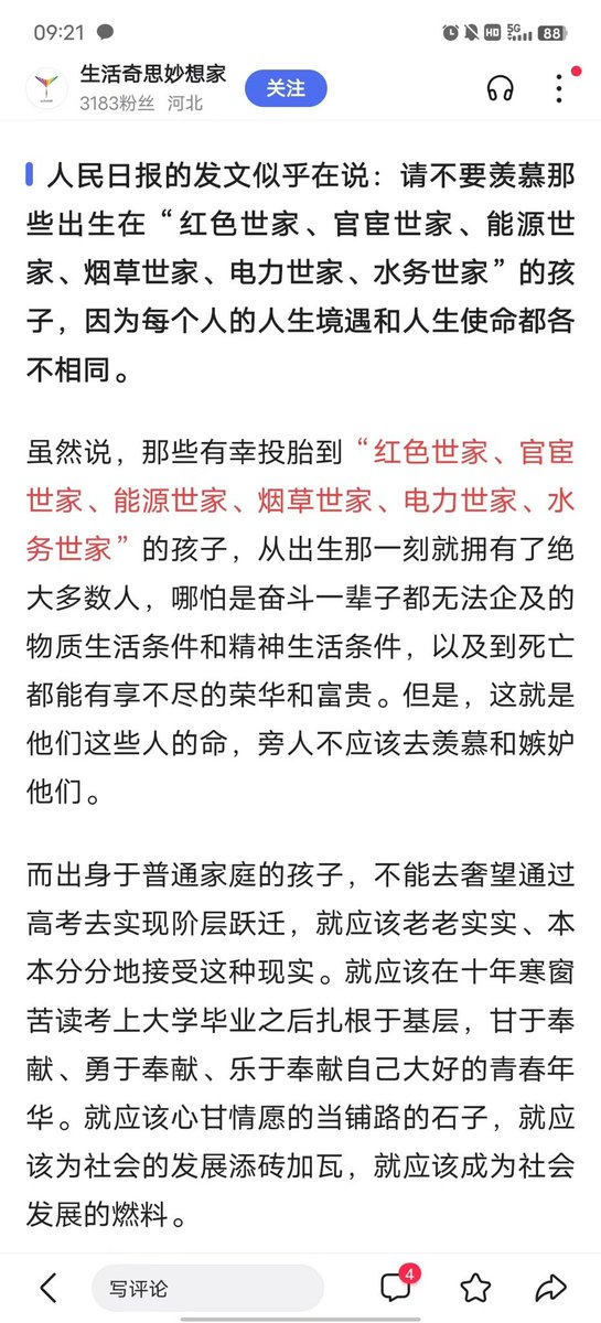 人民日报称,请不要羡慕那些投胎到红色世家、官宦世家、能源世家、烟草世家、电力世家、水务世家的孩子,这是他们的命。…