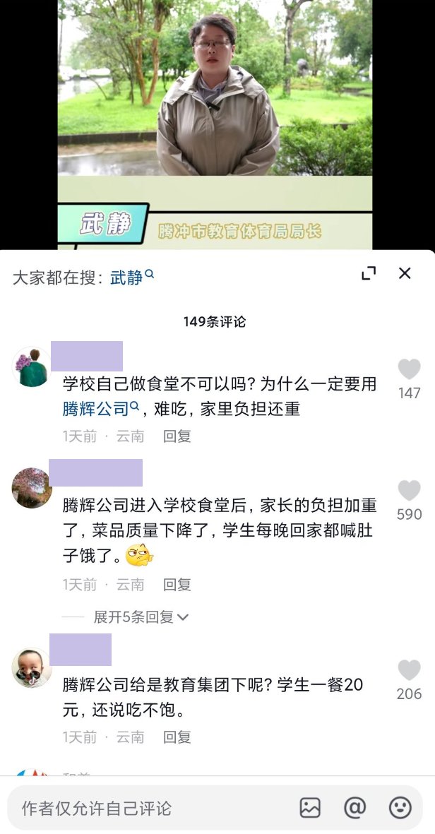 网友投稿“唉!资本!”7月15日,云南省腾冲市教育局回应成立“教育集团”的事宜,引发市民一片骂声。市民们指责现在全市的小初高职学生的吃住全部被腾辉公司垄断, 食堂价格昂贵质量差还吃不饱,甚至饭菜里时常有烟头。表面上说为了教育 为了孩子 其实就是为了垄断。