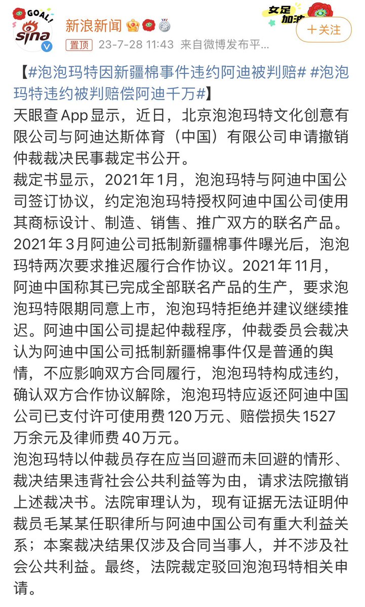 中国公司泡泡玛特因新疆棉问题抵制阿迪达斯,一直推迟双方联名产品的生产,结果因合同违约被判赔千万余元。评论区粉红被中国法院整破防了:爱国怎么有罪了?没错,别人都是口头抵制,怎么你还动真格了?