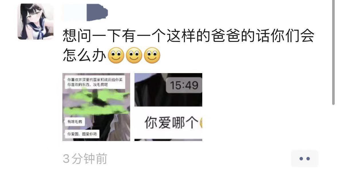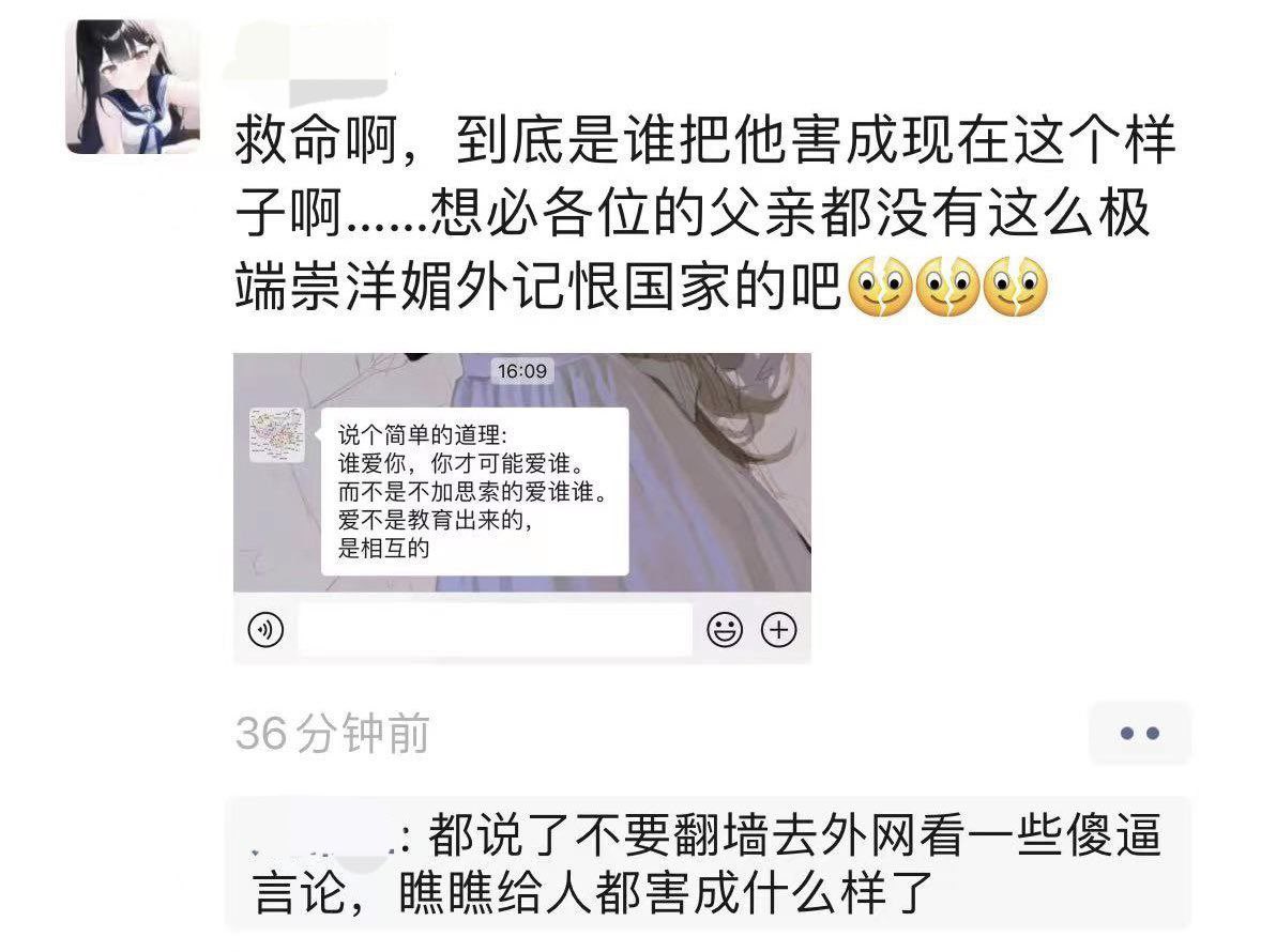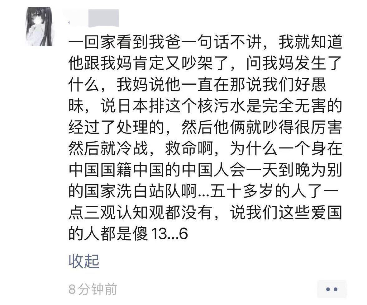 近日有中国网友称父母因为日本核废水排放的问题吵架,控诉其父偷看境外网站变成了“极端崇洋媚外记恨国家”的人,牠爸还说爱国的人都是傻。爸爸教育牠“谁爱你,你才能爱谁”,但是这位中国网友只想祭出打断老子三根排骨的传统艺能。