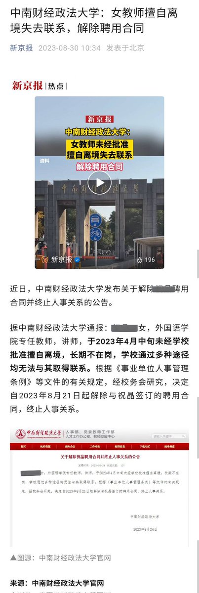 8月30日,中南财经政法大学通报一名女老师未经学校批准擅自离境,且长期不在岗,学校无法与其联系,故决定解除劳务合同。
