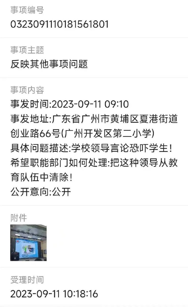 近日,网传广州开发区第二小学的一场演讲中,校领导出言恐吓现场的家长和学生“提醒几件事,不要随意投诉,因为投诉的都考不上高中”之后遭民众举报。
