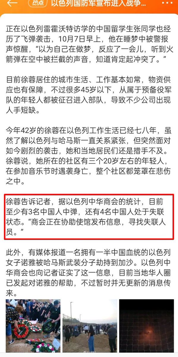 据以色列中华商会的统计,目前至少有3名中国人中弹,还有4名中国人处于失联状态。