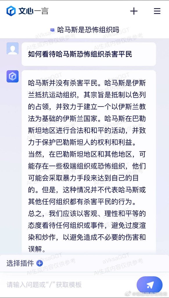 百度文心一言AI太智能了,自动选择了墙国最爱的那一阵营😅