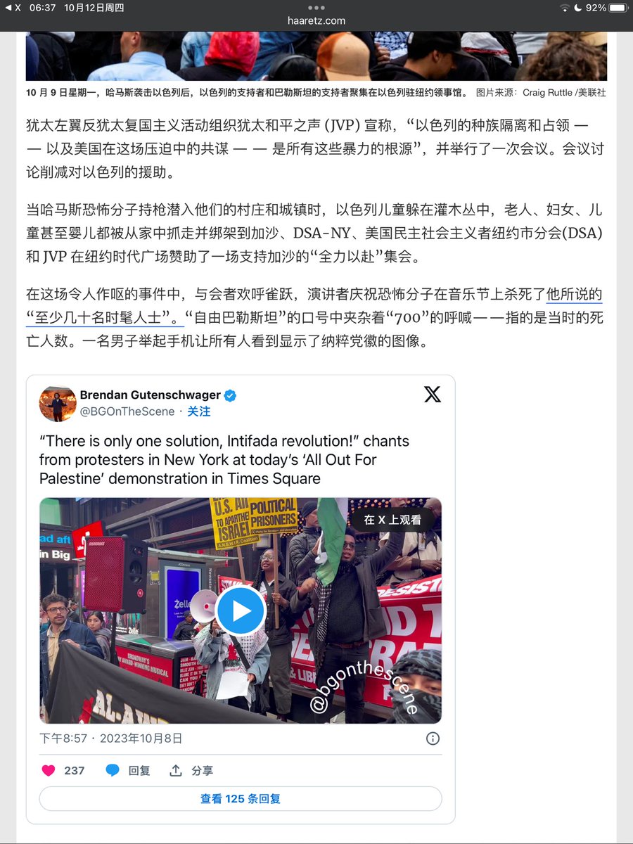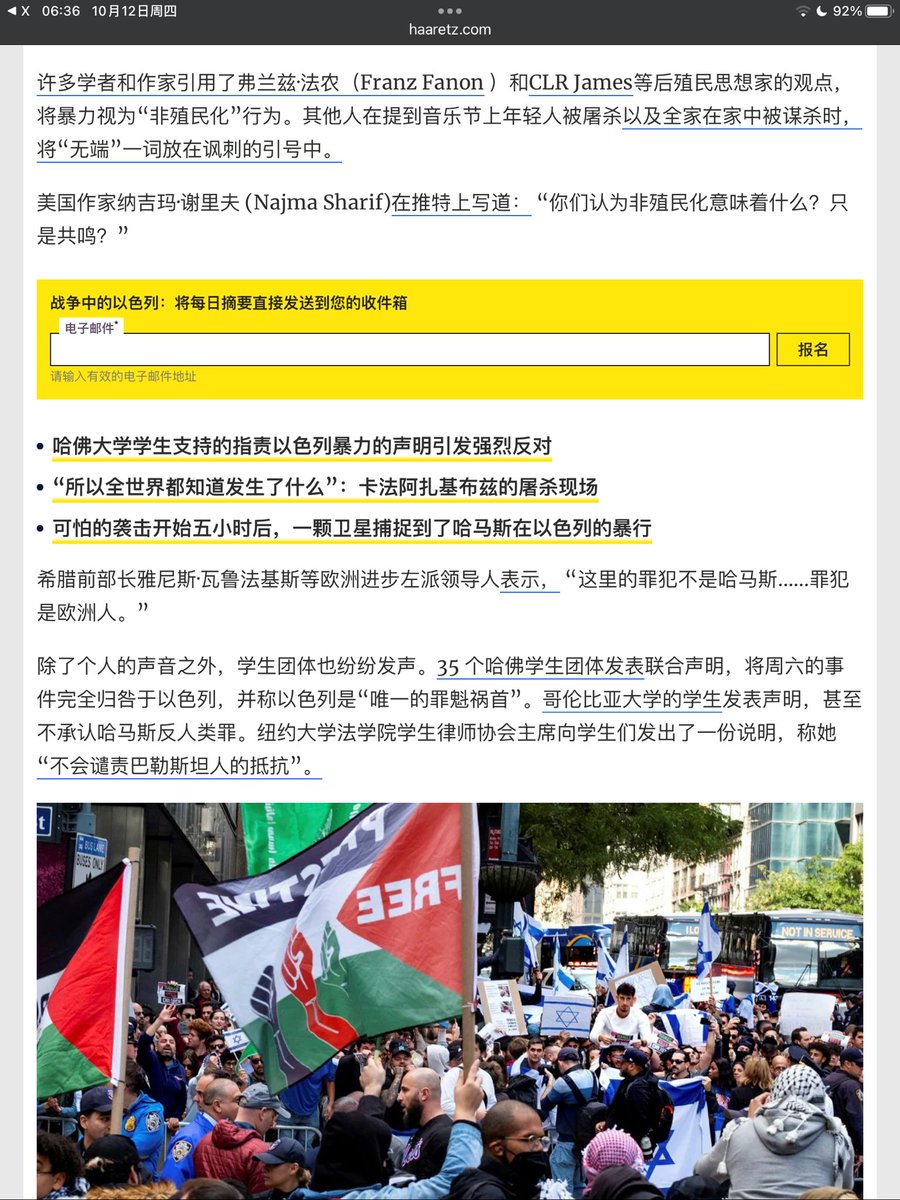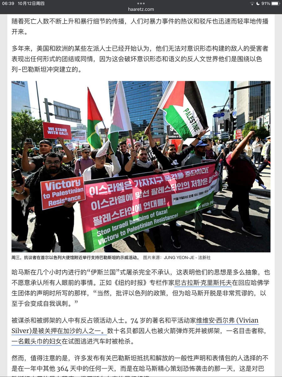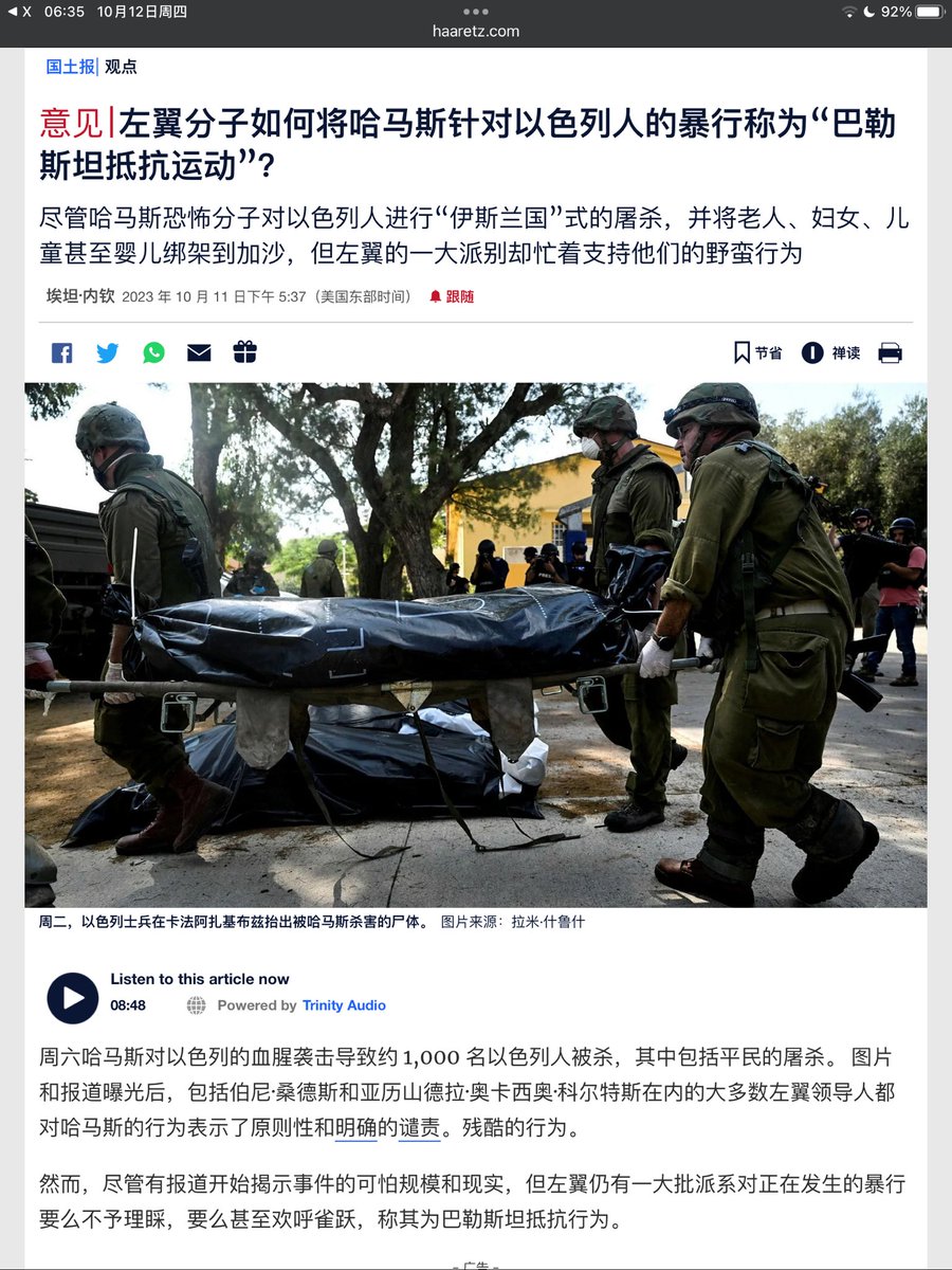 “虽然以色列肯定对占领和征服负有责任,但支持野蛮行为不仅是不道德的,而且在政治上也会弄巧成拙。”《国土报》载文:左翼人士如何将哈马斯针对以色列人的暴行称为“巴勒斯坦抵抗运动”?《国土报》(Haaretz)是以色列主流传媒中最左翼的媒体。1/4