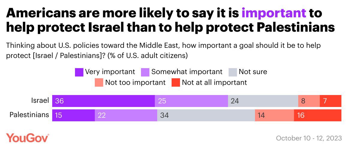americans that say it’s important to protect israelis: 61%protect palestinians: 37% -yougov survey, oct 10-12